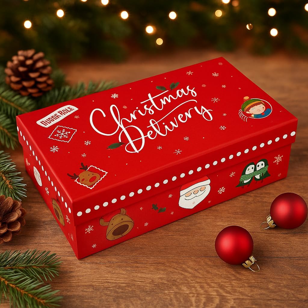 Indulge in the festive spirit with this beautifully packed Christmas chocolate & sweet hamper, perfect for gifting kids, friends, family or colleagues. This colourful holiday themed box is filled with popular chocolate bars, chewy gummies, Christmas themed mini chocolates and classic candy canes - making it ultimate treat bundle for Christmas celebrations. Presented in a premium red Delivery Gift box brings extra cheer, featuring snowflakes, Santa and holiday illustrations - perfect for adding a magical touch to your celebrations.